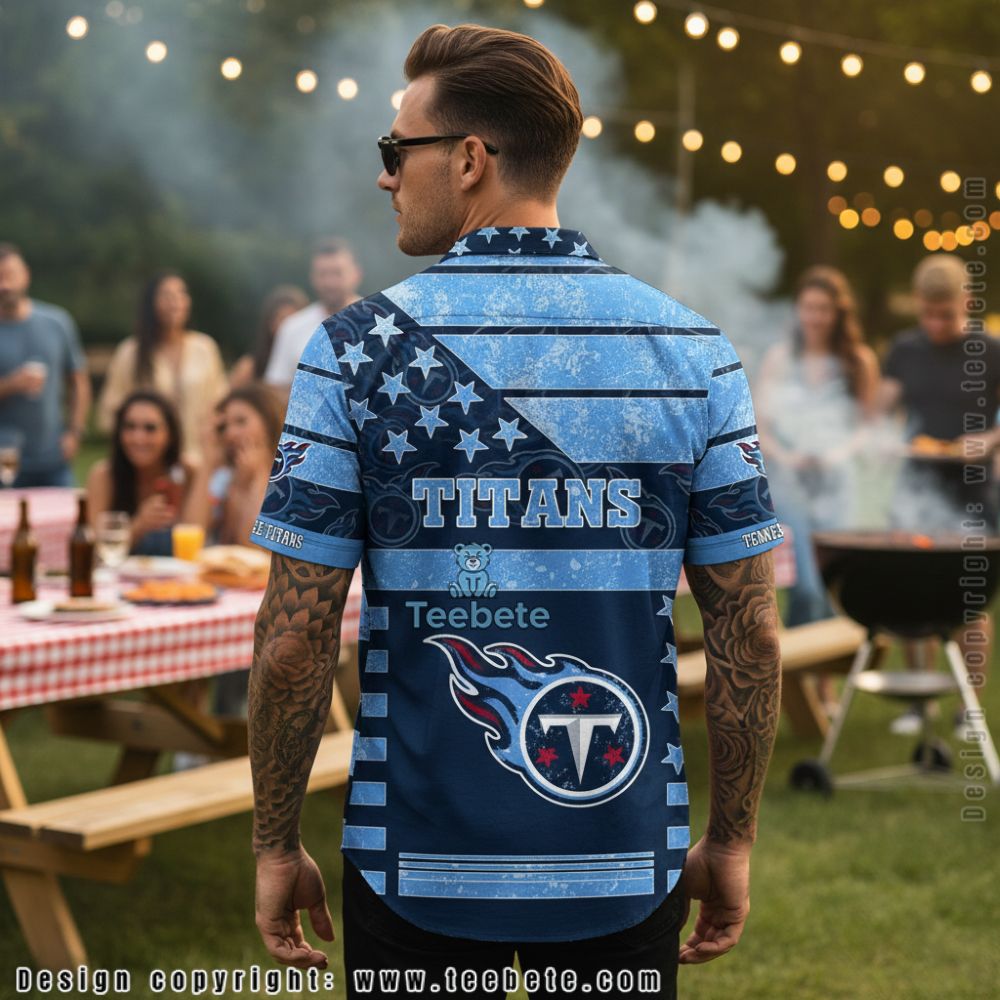 Jersey-inspired elements dominate the Tennessee Titans Custom Name and Number Sporty Game Day Aloha Shirt, featuring horizontal stripes in light blue and navy with distressed texture effects. “TITANS” text appears in large varsity-style lettering across the chest, while a prominent jersey number “64” positions centrally with customizable name “JACKSON” below in matching athletic typography. Star patterns fill the upper right section against navy backgrounds, creating patriotic accent details. Team logos scatter throughout, with “TENNESSEE TITANS” sleeve bands wrapping around both arms. Weathered, vintage overlay effects add worn authenticity to the blue color palette, mimicking aged sports memorabilia aesthetics. This aloha shirt employs full-coverage sublimation printing on a camp collar design, transforming traditional Hawaiian shirt format into personalized athletic apparel.