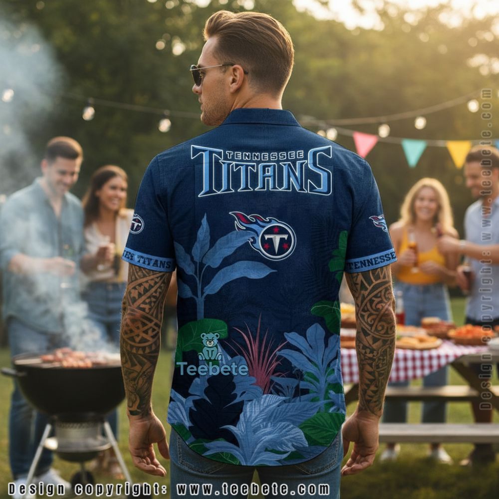 Oversized tropical leaves in navy, sky blue, and emerald green create a gradient botanical arrangement on the Tennessee Titans Fan Gear Exotic Plant Design Summer Party Shirt, flowing from solid navy at the top to lush foliage at the bottom. The flaming team logo positions prominently at the upper chest against the dark background, while large monstera leaves, palm fronds, and exotic plant forms layer across the lower half. Purple-hued tropical flowers add accent color among the verdant greenery, creating depth within the botanical composition. Team logos appear on the left chest and sleeves, with “TENNESSEE TITANS” text wrapping around the sleeve bands. This Hawaiian shirt employs gradient sublimation printing on a camp collar button-front design, where solid team colors transition seamlessly into vibrant jungle imagery.
