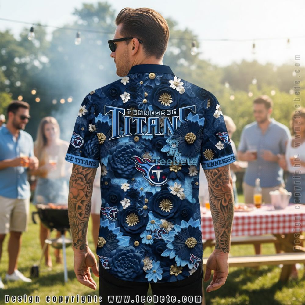 Layered floral blooms in light blue, white, and gold create dimensional depth on the Tennessee Titans Floral Print Summer Beach Fashion Aloha Shirt, set against deep navy backgrounds with decorative swirl patterns. Large daisy-like flowers with prominent centers mix with smaller delicate blossoms throughout the composition, while ornamental circular motifs in textured gold and navy add decorative variety. The flame-accented team logo positions prominently at the chest, surrounded by the dense botanical arrangement. Team logos scatter among the flowers like hidden gems, integrating branding naturally within the floral landscape. “TENNESSEE TITANS” sleeve bands wrap around the arms in contrasting text. This aloha shirt employs rich sublimation printing on a camp collar design, where varied flower scales and decorative elements create sophisticated tropical styling with elegant detail.