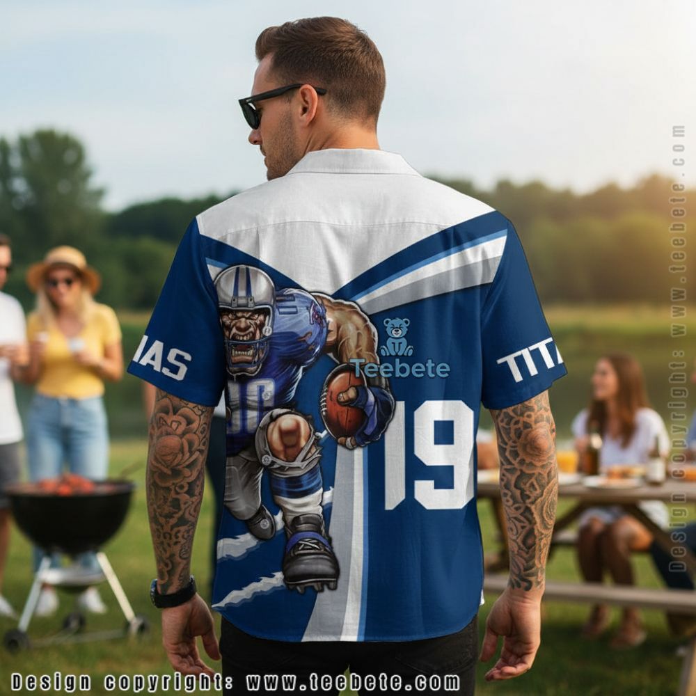 Dynamic cartoon illustration of a charging football player dominates the Tennessee Titans Football Player Pattern Summer Hawaiian Shirt, rendered in bold comic book style with exaggerated muscular proportions. The character wears full team uniform in navy and light blue, clutching a football while bursting forward in an aggressive running pose with determined facial expression. Jersey number “19” appears on the upper right shoulder against white color-blocking, while partial team name text wraps around the sleeves on navy sections. White and navy panels create athletic jersey-inspired structure through vertical divisions and horizontal stripes. The illustration employs shading and highlights that give three-dimensional depth to the character’s armor-like uniform and dynamic motion lines. This Hawaiian shirt uses sublimation printing on a camp collar format, transforming sports illustration into wearable tropical styling.