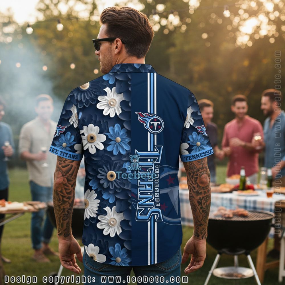 Large daisy blooms in white and light blue scatter across the Tennessee Titans Navy Blue Daisy Floral Pattern Hawaiian Shirt, creating cheerful contrast against the rich navy background. The simple flower forms feature prominent golden-brown centers surrounded by clean petals, delivering classic daisy charm in varied sizes throughout the composition. Vertical white racing stripes run down the right side alongside “TENNESSEE TITANS” text in outlined lettering, adding athletic structure to the floral design. The flame-accented team logo positions prominently at the chest, while additional logos appear on the sleeves. Subtle tonal patterns in the navy backdrop add texture without overwhelming the bright floral elements. This Hawaiian shirt employs sublimation printing on a camp collar format, where cheerful daisy graphics meet sports jersey striping for hybrid styling.