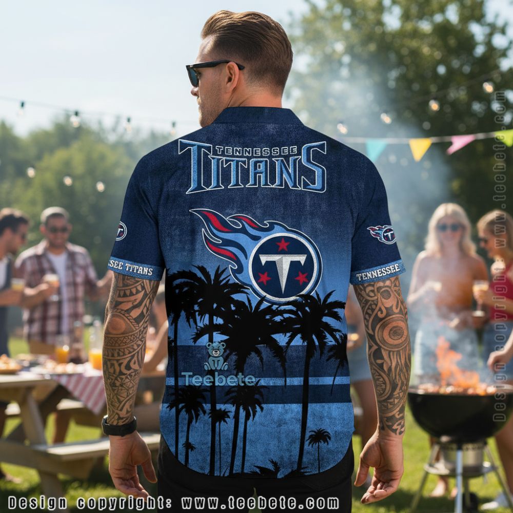 Gradient design transitions from deep navy to light blue on the Tennessee Titans Tropical Floral Hibiscus Pattern Summer Beach Shirt, featuring black palm tree silhouettes across the lower section. The flame-accented team logo anchors the upper navy zone prominently, while horizontal stripes in varying blue tones create sunset-inspired banding below. Palm trees of different heights stand against the gradient backdrop, creating classic coastal scenery reminiscent of twilight beach landscapes. Team logos appear on both shoulders, with “TENNESSEE TITANS” sleeve bands wrapping around the arms in white text. The ombre effect flows smoothly from dark to light, mimicking dusk sky transitions where deep evening blues fade into lighter horizons. This beach shirt employs gradient sublimation printing on a camp collar design, where scenic palm silhouettes meet team branding through color-fade techniques.