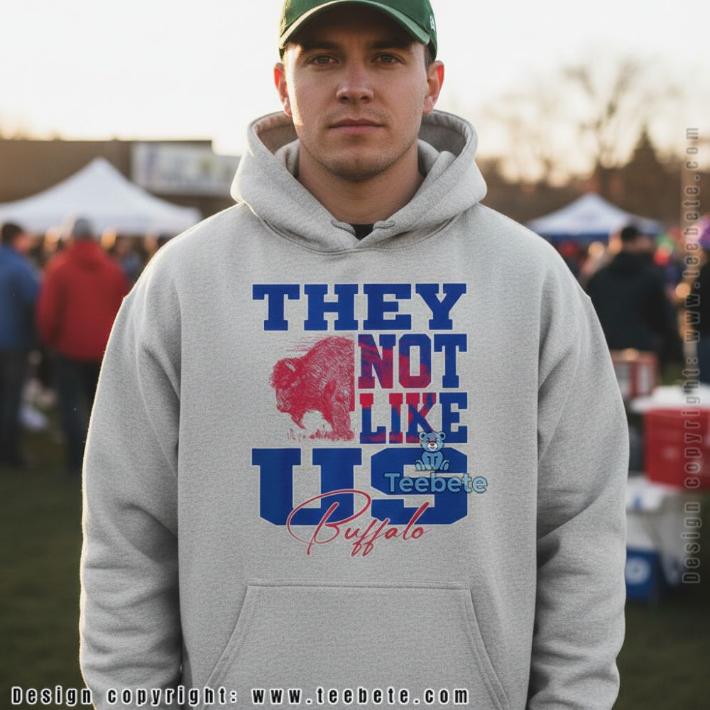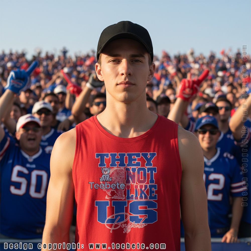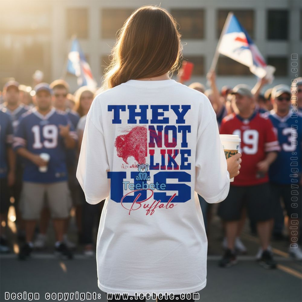 Celebrate your fandom with the They Not Like Us Buffalo Bills Fan Shirt, a perfect addition to any collection of vibrant apparel. This T-shirt showcases a dynamic graphic layout that includes a bold, expressive design featuring striking text and imagery directly linked to the Buffalo Bills’ spirit. The color palette juxtaposes the team’s iconic colors, creating high contrast that demands attention. Utilizing full-coverage printing ensures that the design flows seamlessly across the fabric, capturing the essence of team pride in every detail.