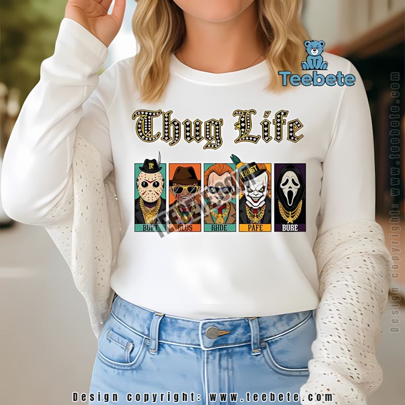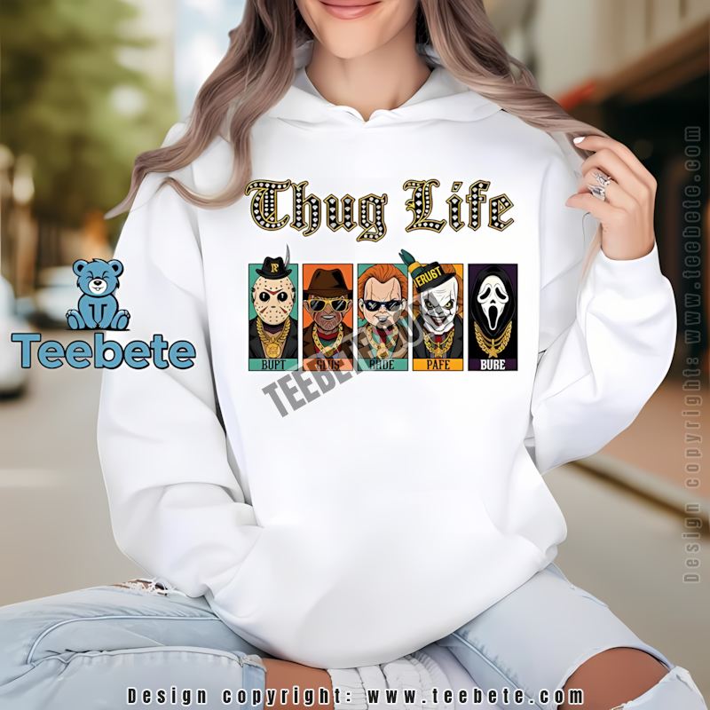 Don’t miss out on this opportunity to showcase your passion. Order the Thug Life Jason Freddy Chucky Pennywise Ghostface Halloween Retro Shirt today and step into a world where fear meets fashion!