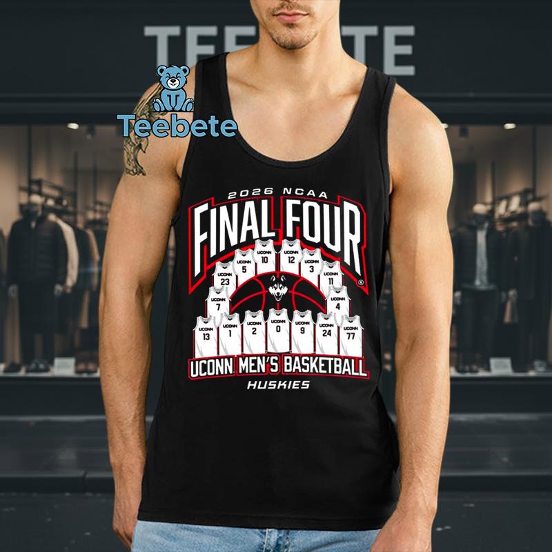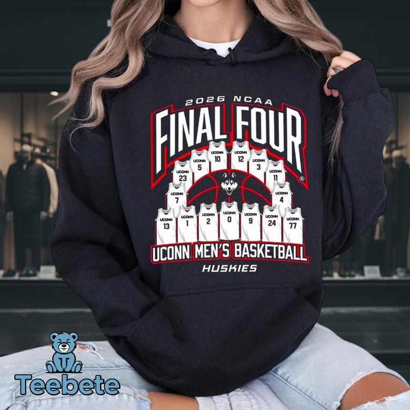 A vibrant graphic illustration commands attention on the UConn Huskies Women’s Basketball 2026 Championship Run Final Four Tee. Featuring the iconic UConn Huskies logo prominently, the design incorporates playful typography that captures the excitement of the championship event. Set against a dynamic background in the team’s deep blue and white colors, the elements are layered with striking contrast that pops from the fabric. Full-coverage graphics allow every detail to shine, creating a visually compelling statement piece for any fan.