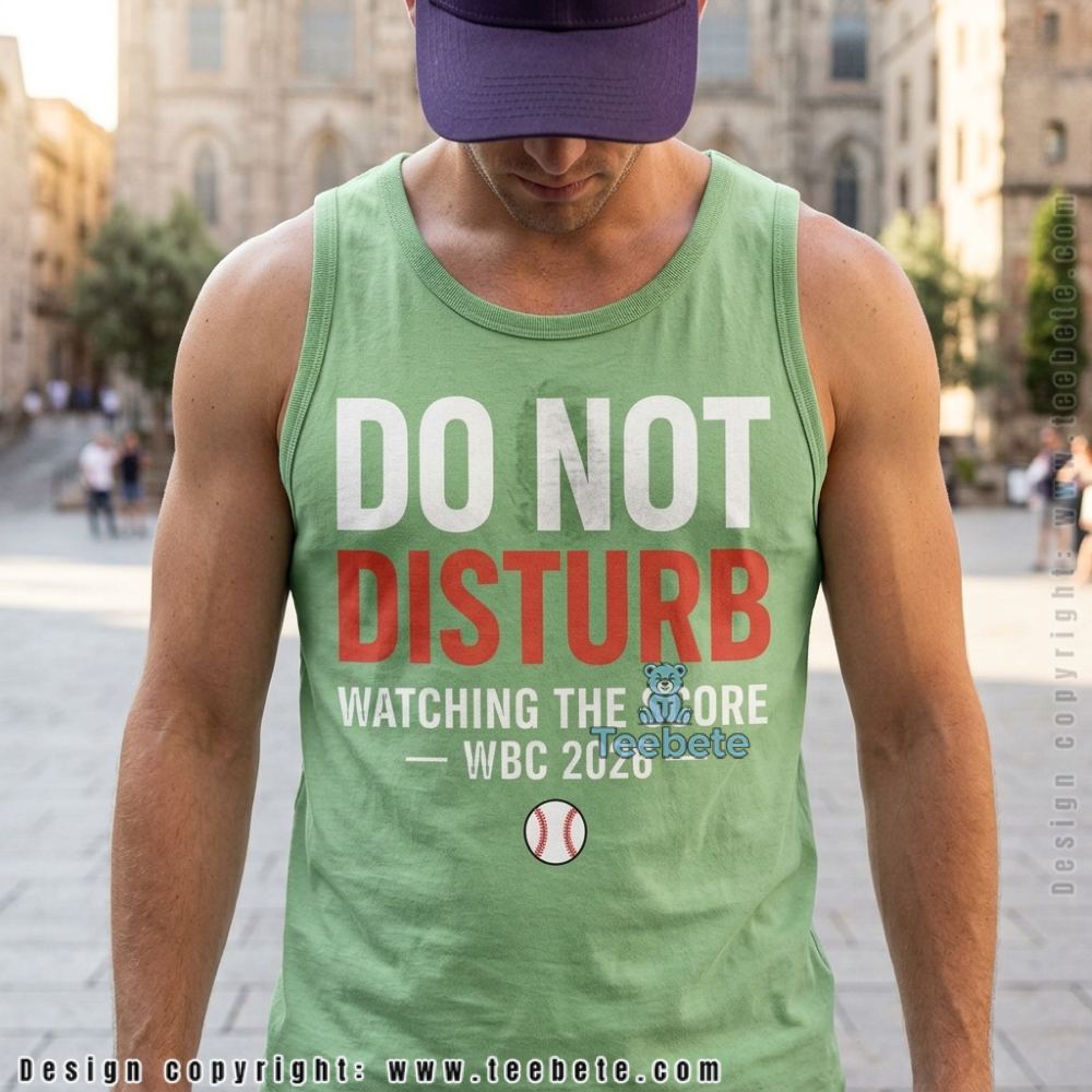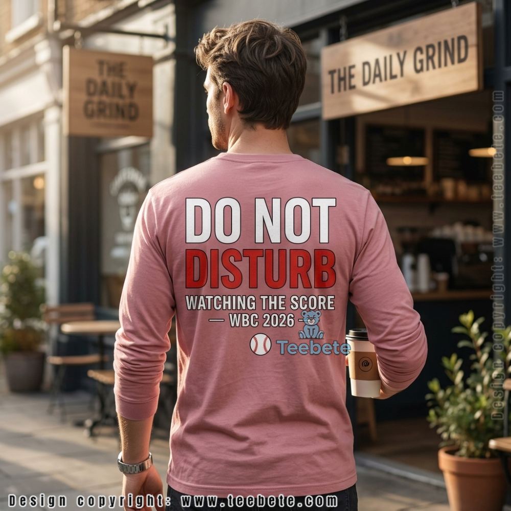 Against a dramatic black ground, the WBC Score Shirt 2026 Do Not Disturb Watching Baseball features a playful all-over print of vintage baseball motifs, where illustrations of bats, balls, and gloves are interspersed with humorous text elements. The color palette employs saturated reds and soft whites that pop against the darker backdrop, creating a lively yet cohesive visual experience. Print density varies across the shirt, with a fuller application across the torso that gradually thins toward the sleeves, providing a balanced sense of movement throughout the design.