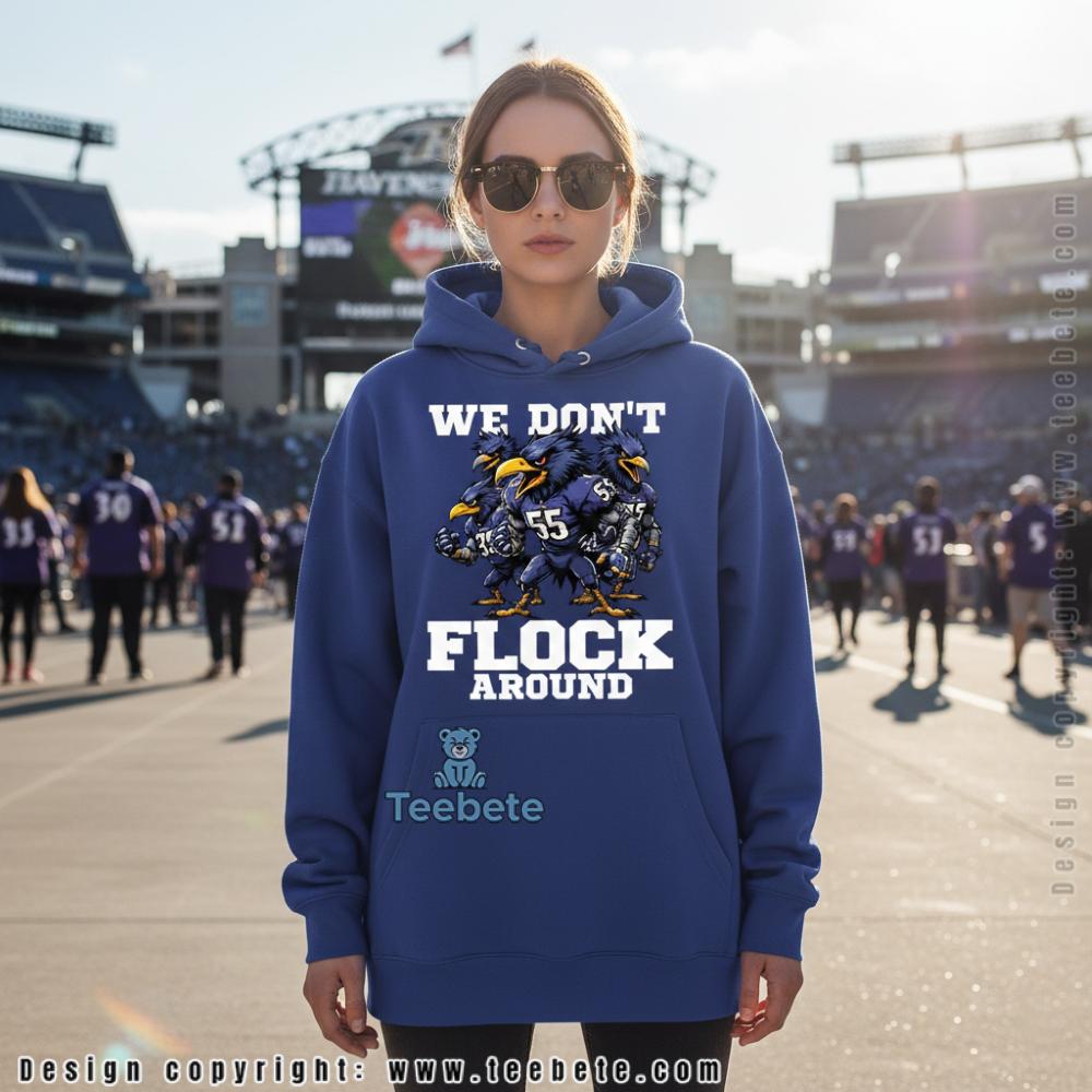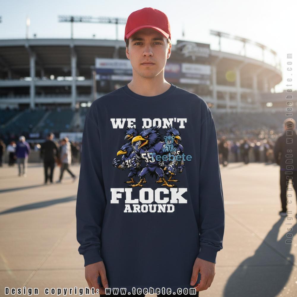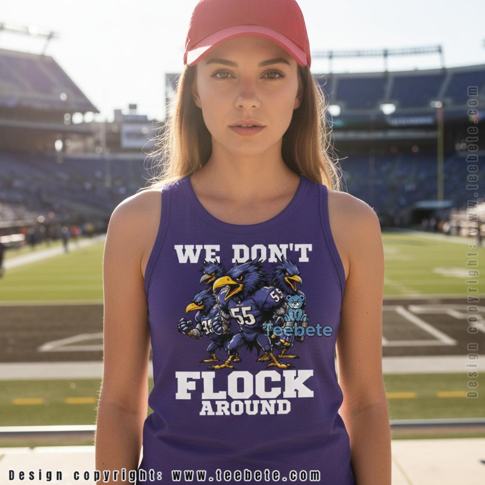 Aggressive cartoon ravens form a menacing huddle on this statement tee, the bird characters depicted in muscular, intimidating poses wearing purple Ravens uniforms with prominent jersey numbers including 55. “WE DON’T” appears in bold white block lettering above the fierce bird gang, while “FLOCK AROUND” completes the defiant declaration below in matching typography. The We Don’t Flock Around Baltimore Ravens Fan Shirt features the illustrated ravens rendered with exaggerated tough-guy postures—arms crossed, shoulders hunched forward, faces scowling—creating a street gang aesthetic that plays on the team name. Gold beaks and talons add authentic team color accents to the predominantly purple and navy character designs against solid black fabric. The wordplay transforms the innocent team nickname into a warning about the Flock’s serious nature, with centered graphic placement delivering the message through classic crew neck t-shirt construction.