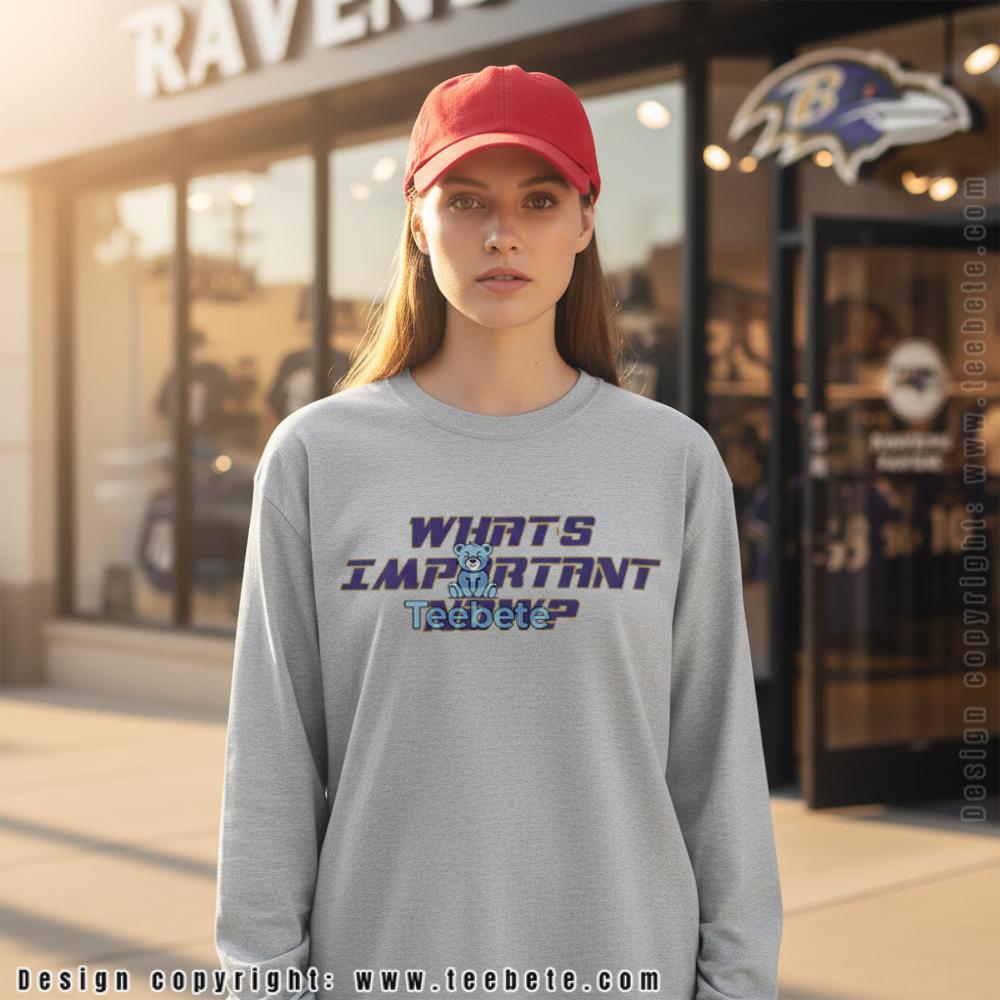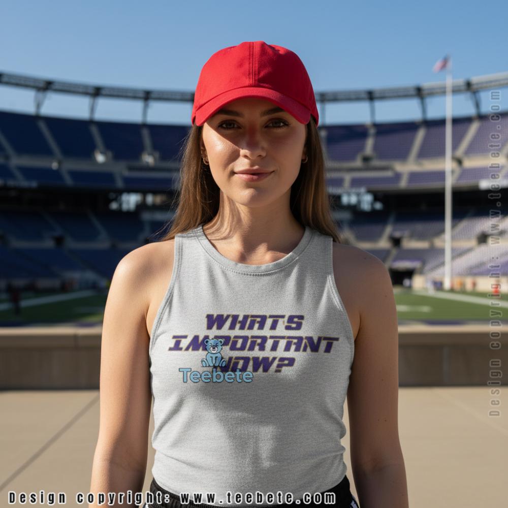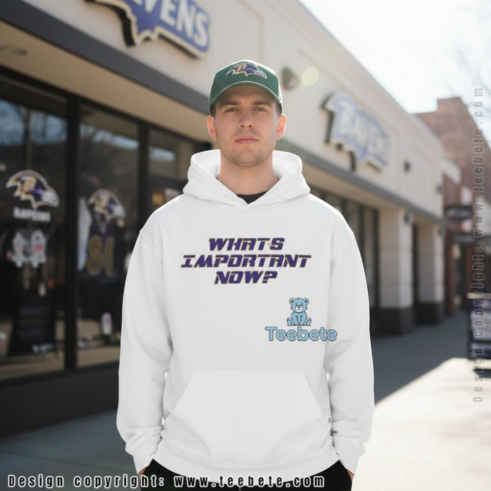 Italicized purple lettering with gold outline creates a simple yet powerful message on this motivational shirt, with the three-word question arranged in stacked formation across the chest. “WHAT’S IMPORTANT NOW?” appears in slanted typography that conveys forward momentum, each letter outlined in metallic gold that adds Ravens team color authenticity. The What’s Important Now Baltimore Shirt features this focused mantra centered against black fabric, creating stark contrast that ensures the message reads clearly from a distance. The italic styling adds urgency and motion to the text, while the dual-color treatment—purple fill with gold border—maintains visual connection to Baltimore branding without requiring additional logos or graphics. Classic crew neck construction with centered text placement delivers the mindset coaching through minimalist design approach that lets the powerful question speak for itself.