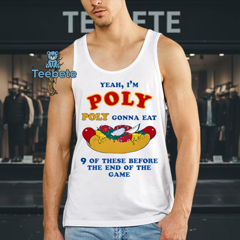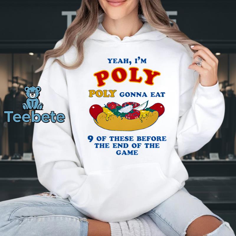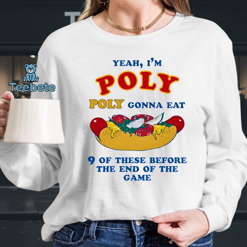 A playful declaration sprawls across the front of this T-Shirt, turning heads and sparking smiles with its humorous take on game day enthusiasm. The “Yeah I’m Poly Gonna Eat 9 Hot Dogs Before Game Ends Funny T-Shirt” showcases a spirited graphic that artfully combines fun typography with clever illustrations, all set against a rich backdrop. The color palette fuses vibrant shades, creating an appealing contrast that invites laughter while emphasizing the lighthearted spirit of the design. The centered composition ensures that the artwork captures attention from every angle, making it an ideal choice for any casual gathering.