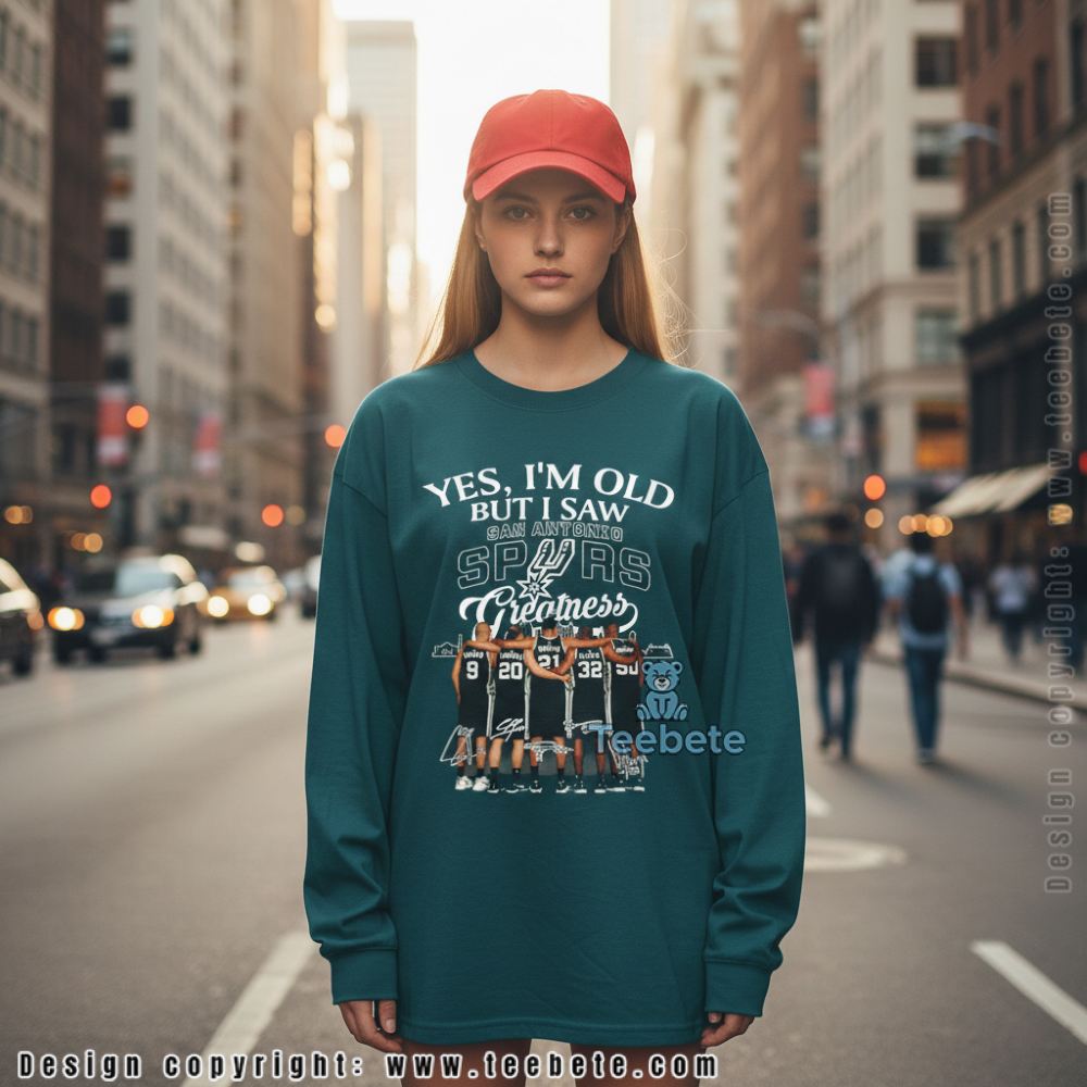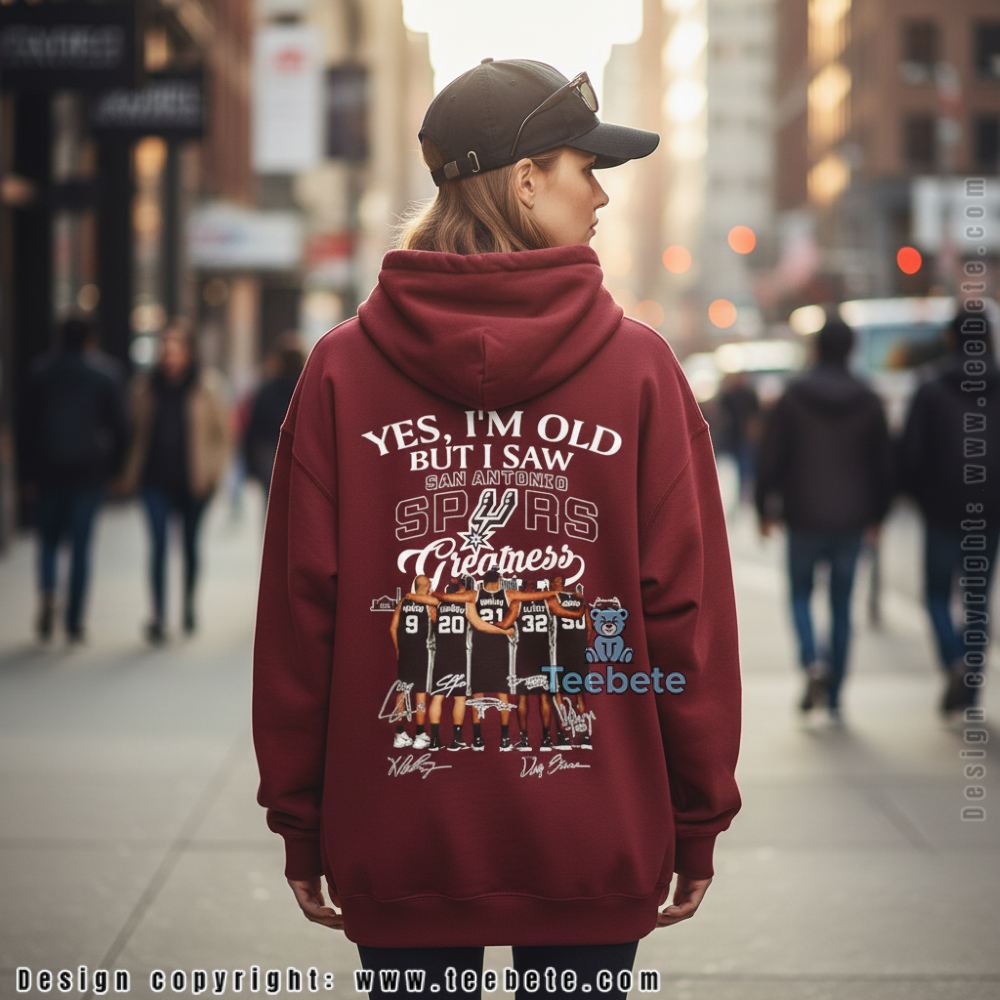 “YES, I’M OLD BUT I SAW SAN ANTONIO SPURS GREATNESS” is printed in bold, vintage-style white typography across the top of the graphic.